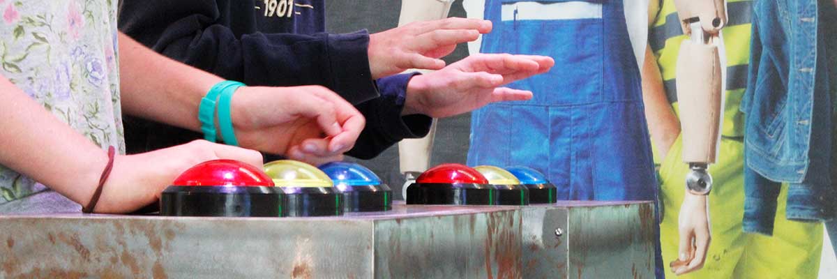 Die Buzzer Stationen sind einfach aufgebaut. Mit drei farbigen Buzzer-Knöpfen kann das komplette Spiel gesteuert werden. Die haptische Wahrnehmung lädt gerade zu ein, die Buzzer-Knöpfe zu betätigen. Das Innenleben der Buzzer Stationen besteht aus einem Arduino-Board. Damit kann das Signal der Buzzer-Knöpfe einfach interpretiert und zur Steuerung der Game Software verwendet werden.