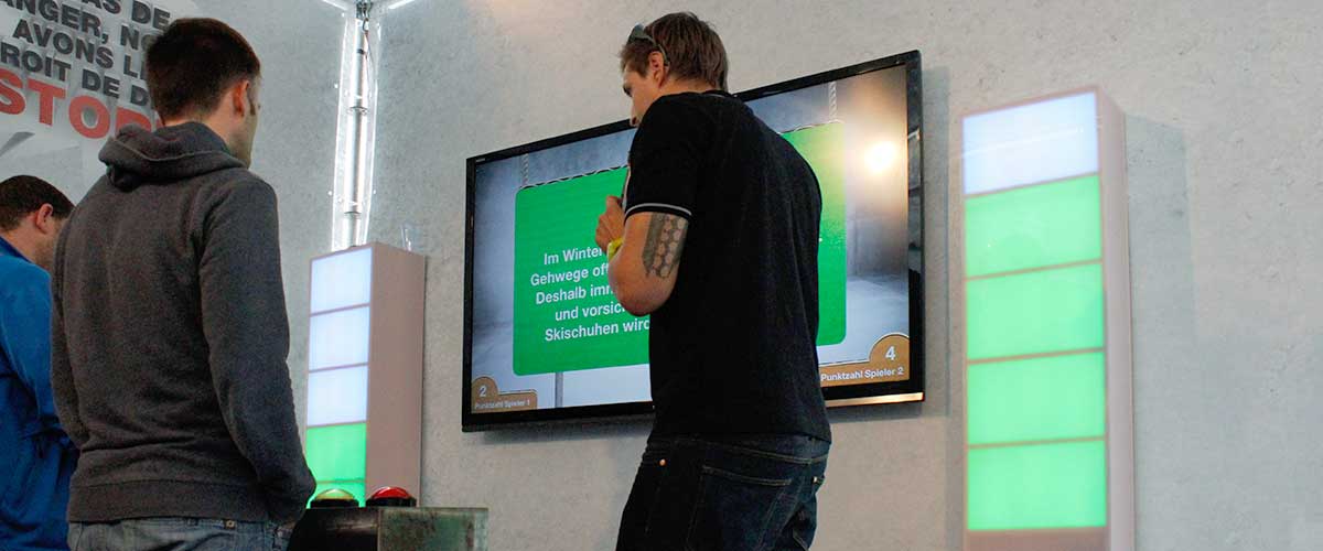 Das Herzstück des Suva Event-Pavillons ist ein interaktives Quiz Game. So werden die Besucher zum Mitmachen animiert und lernen gleichzeitig auf eine spielerische Art verschiedenen Themen rund um die Suva kennen. Iterativ realisierte diese attraktive Installation von der Konzeption bis zur Umsetzung.